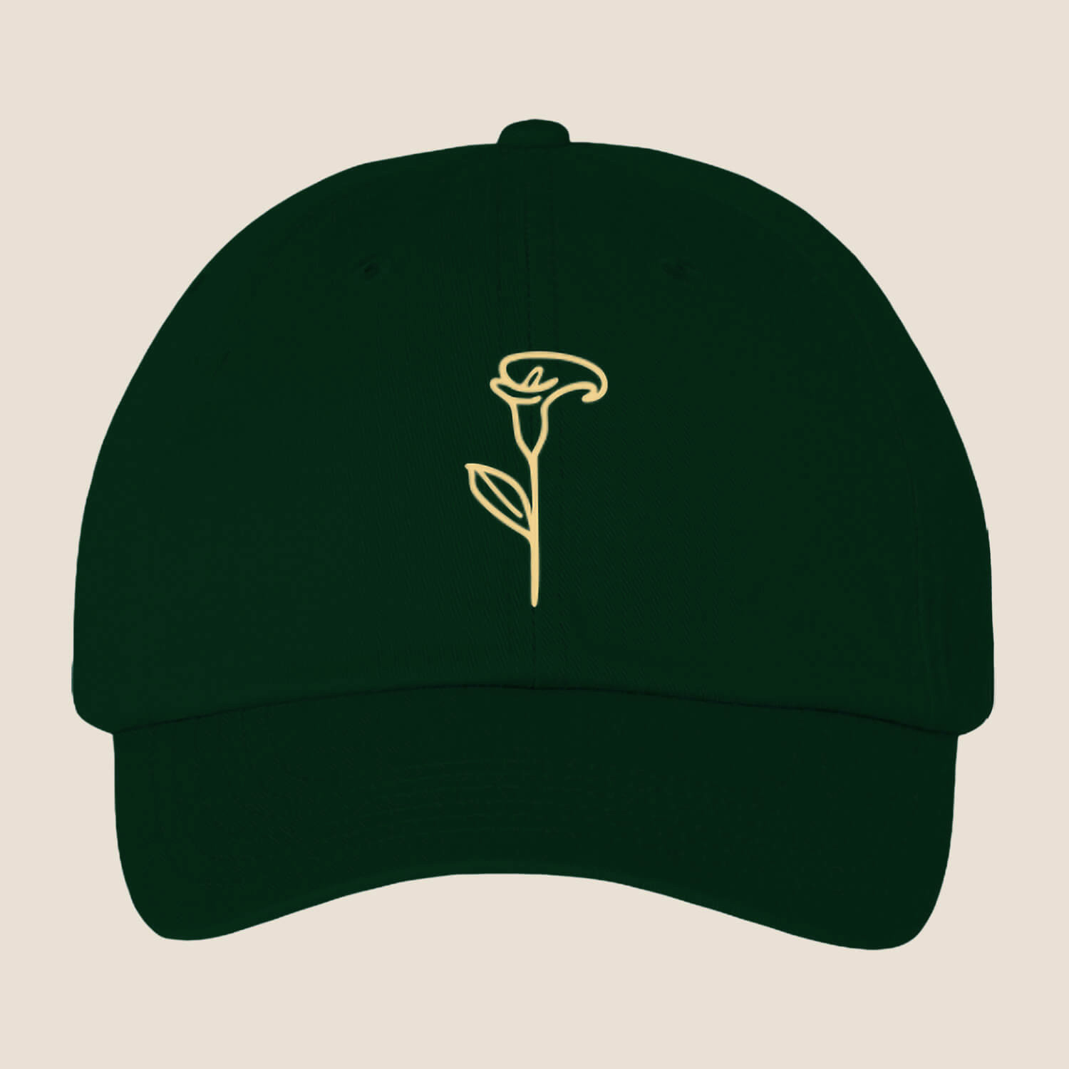 A 100% organic-cotton dad cap in forest green, embroidered with our Calla Lily emblem. Designed for off-duty garden hours and quiet days in the dirt.